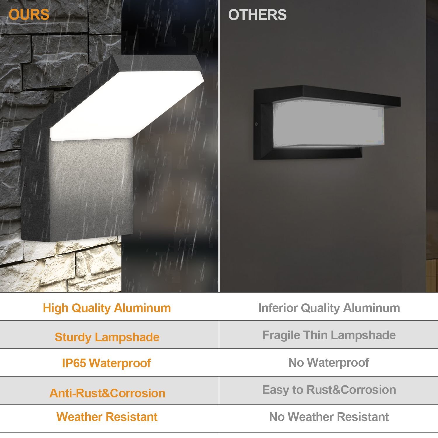3.Waterproof & weather resistant: IP65 with quality aluminum. This outdoor wall sconces made of high quality aluminum. External lamp is anti-rust & corrosion. Suitable for heavy rain, cloudy, sleet, snowy, scorching sun, light fixture will still perfect after years of using.